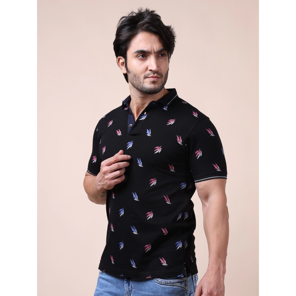 Men’s Casual Cotton Printed Polo Neck Half Sleeve T-Shirt (Black)