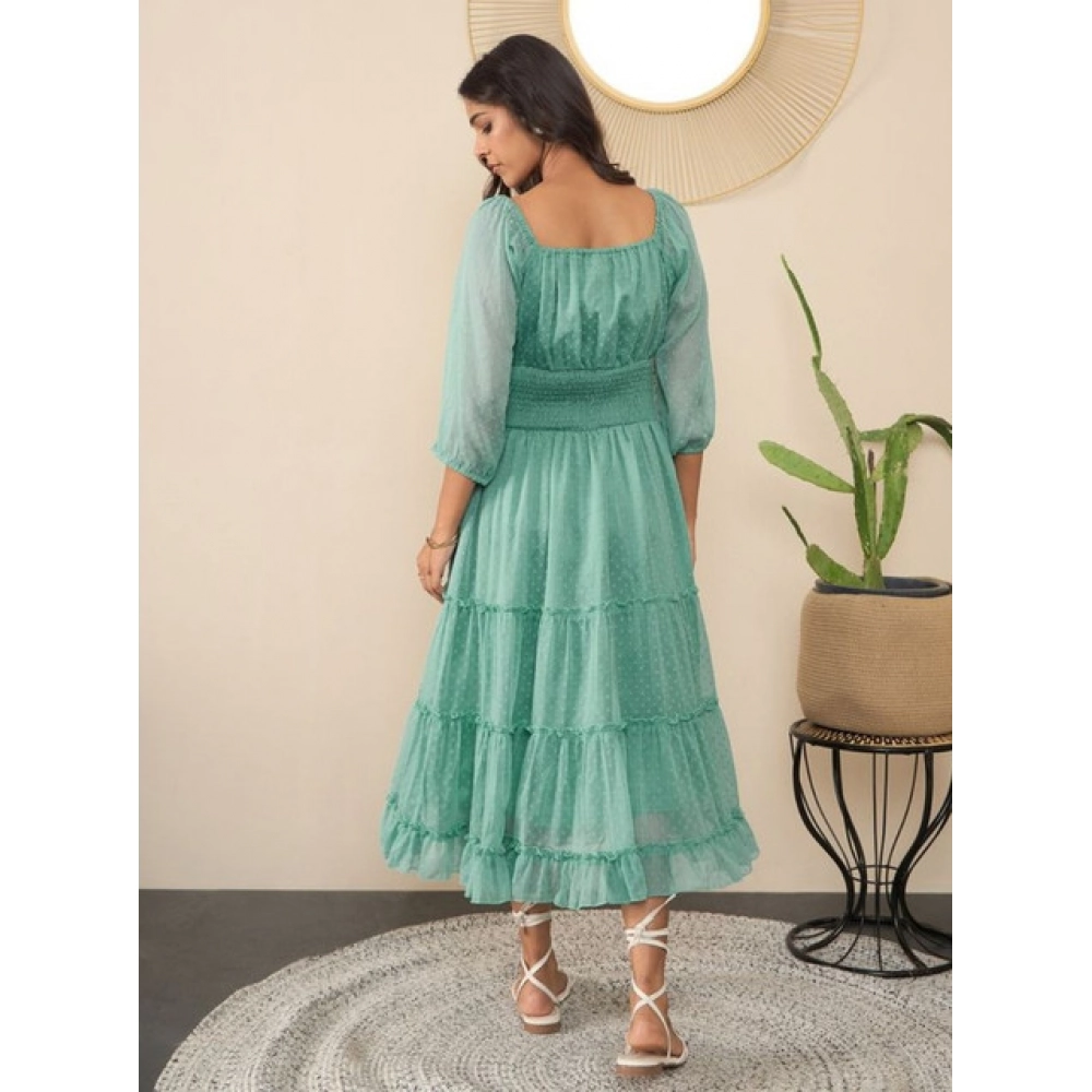 Women’s Chiffon Solid Puff Sleeve Dress (Green)