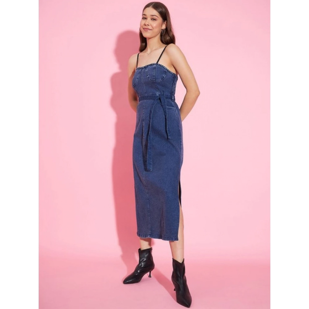 Women’s Denim Solid Shoulder Straps Dress (Blue)