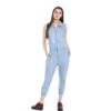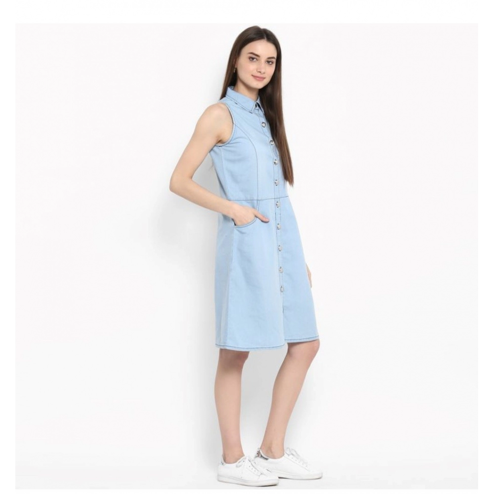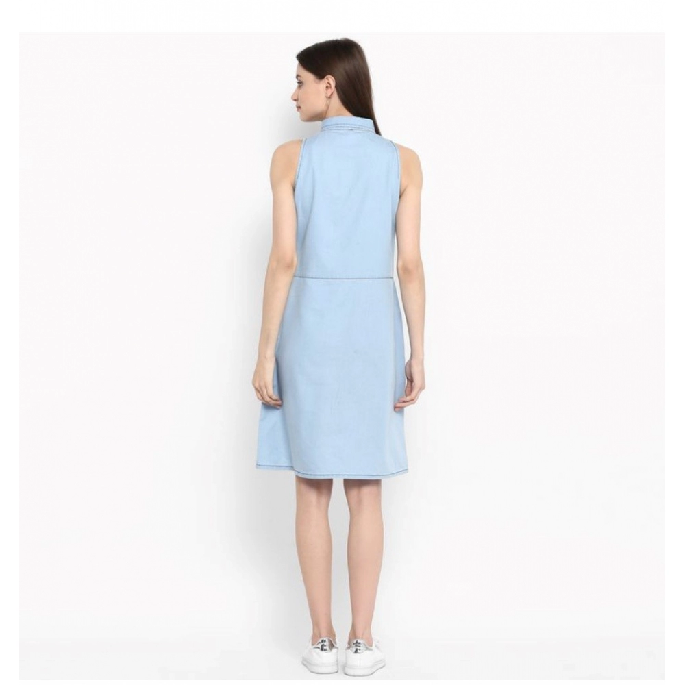 Women's Denim Solid Sleeveless Below Knee Dress (Blue)Women’s Denim Solid Sleeveless Below Knee Dress (Blue)