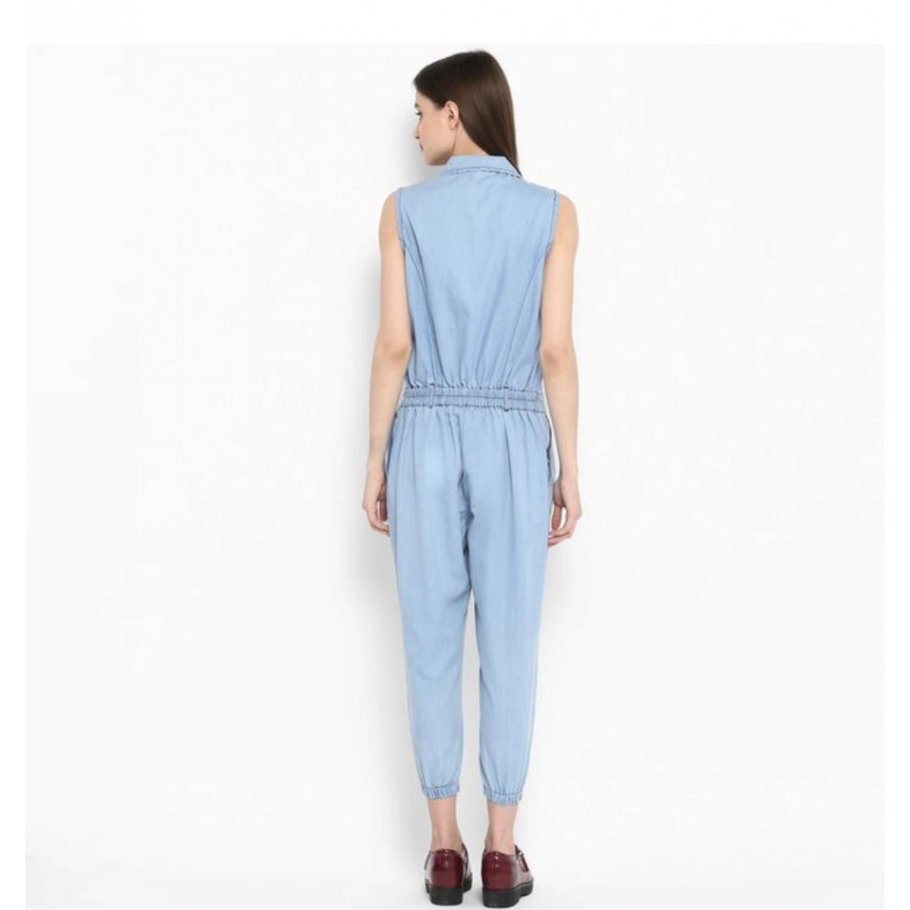 Women’s Denim Solid Sleeveless Jumpsuit (Blue)