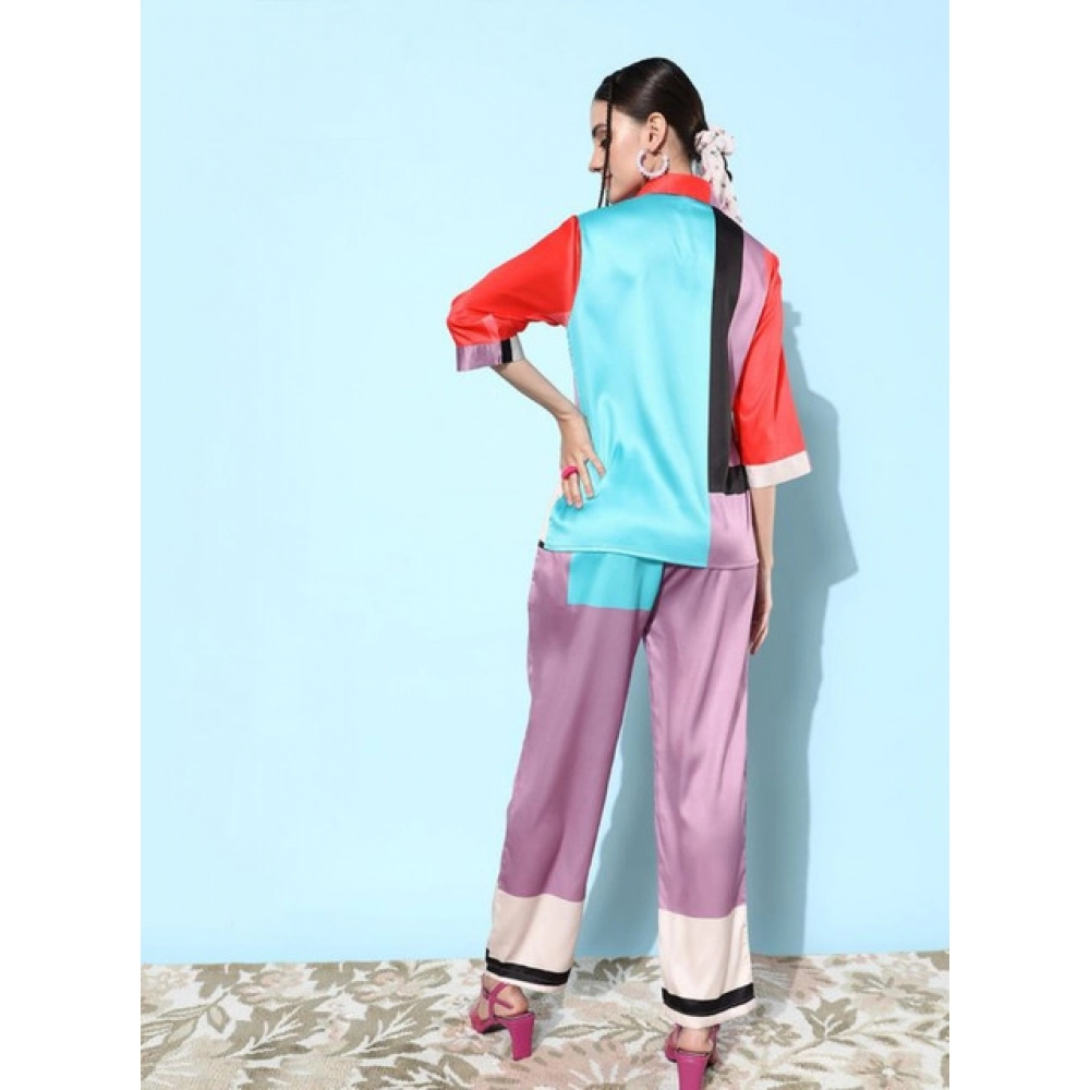 Women’s Satin Colour Block Long Sleeves Co-Ord Set (Multicolor)