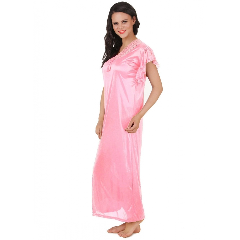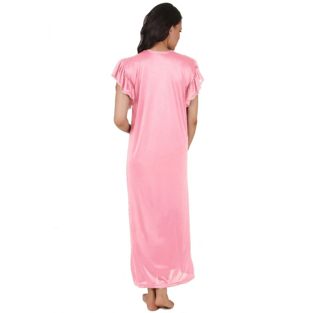 Women’s Satin Long Nighty Frill Sleeve(Color: Baby Pink, Neck Type: V Neck)